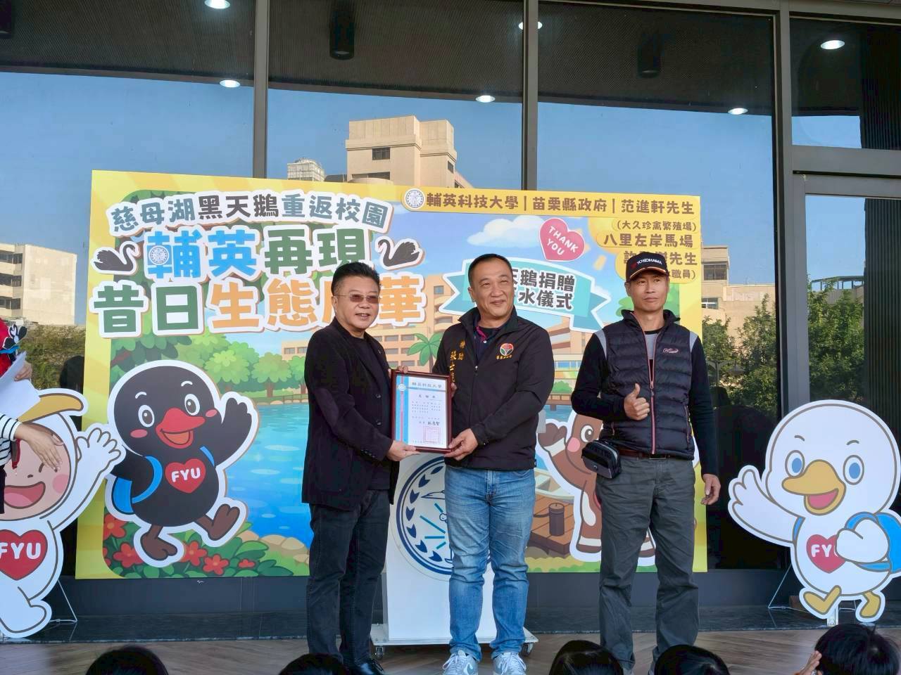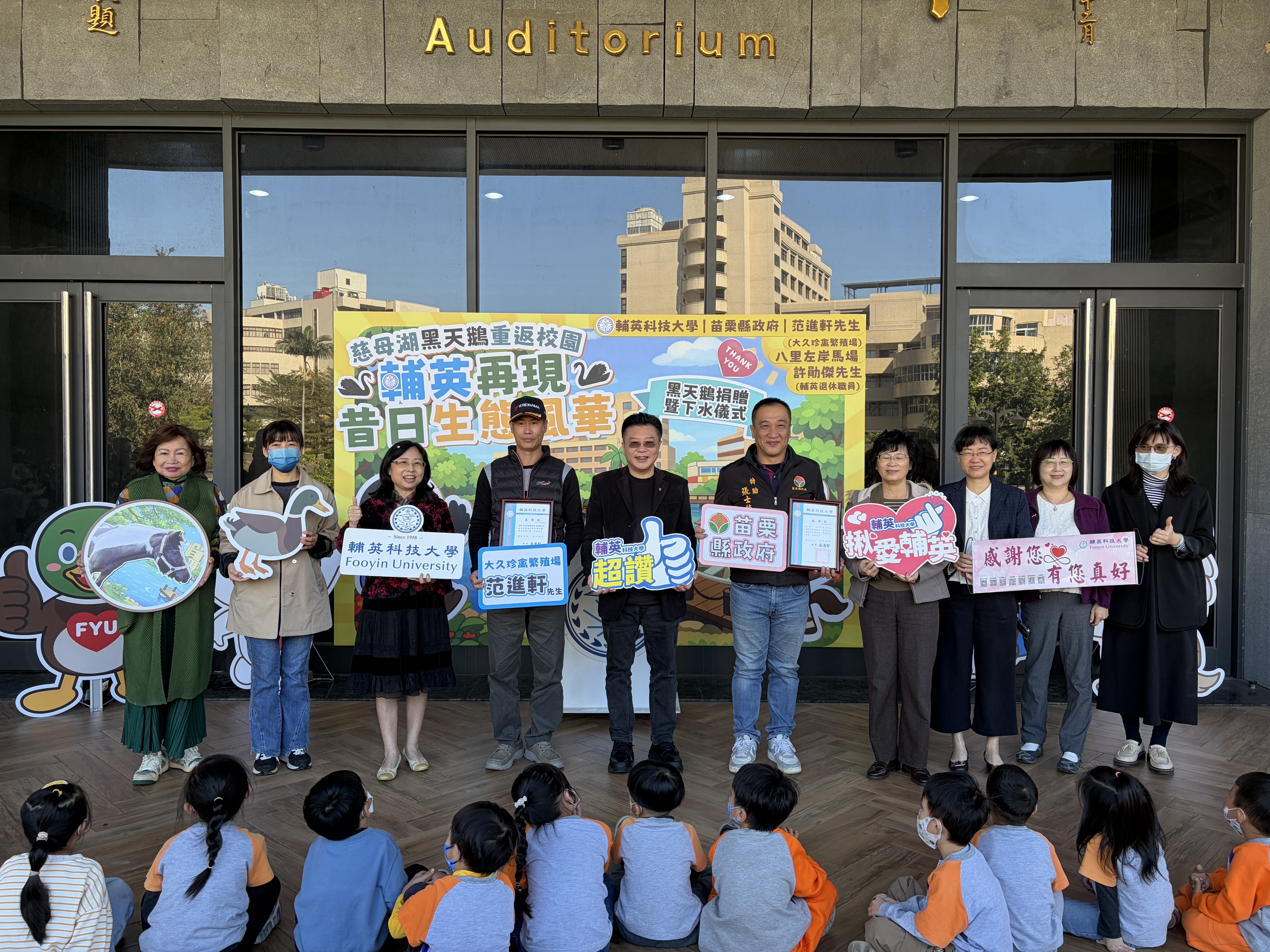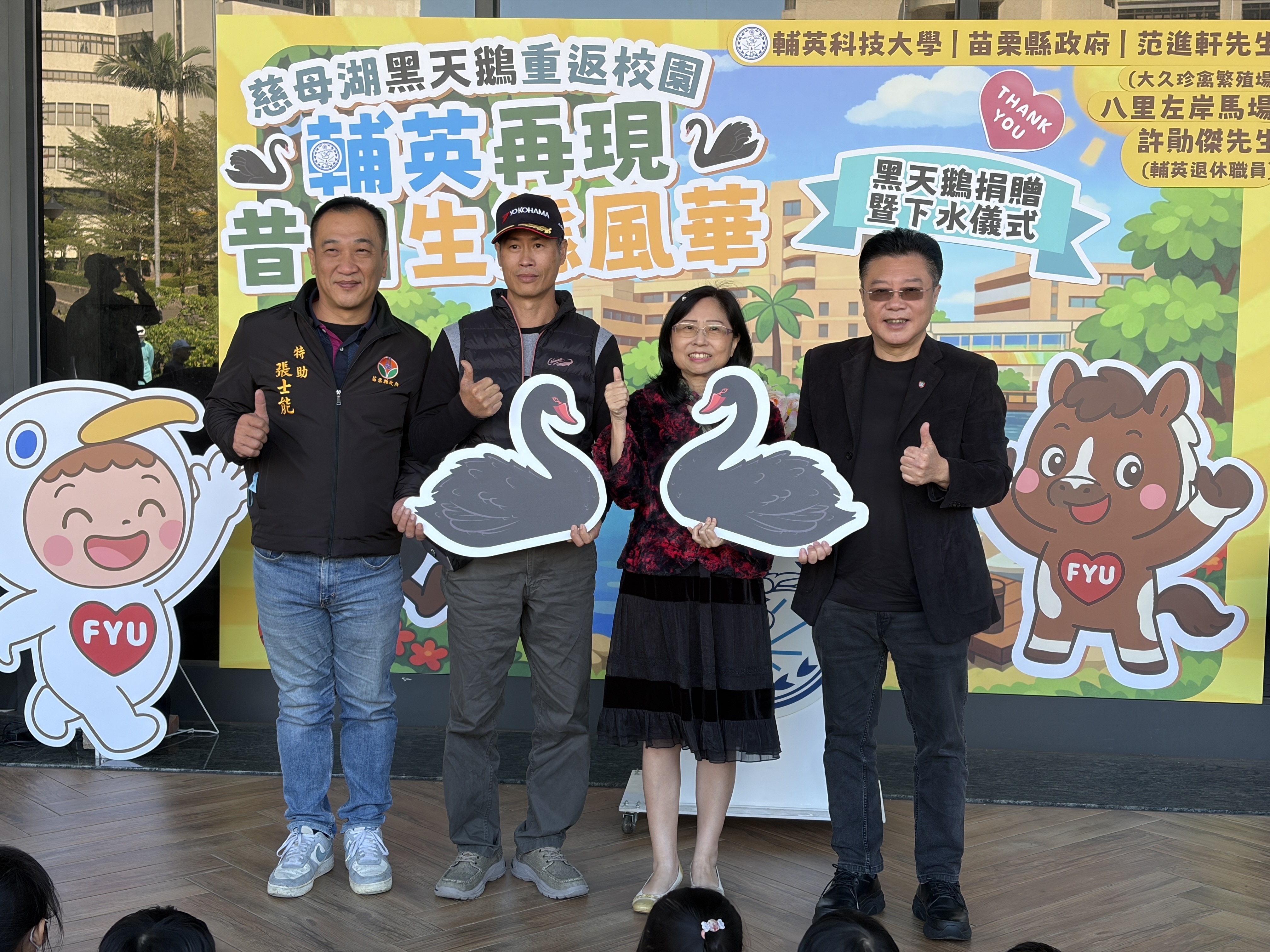 黑天鵝捐贈暨下水儀式於五日上午在中正堂舉行,由張可立董事長偕同林惠賢校長率領校內主管、終身名譽校友顧問徐麗月董事長、輔英附設幼兒園邱錦娥園長及全體師生,熱情迎接苗栗縣政府代表縣長特助張士能賢伉儷及大久珍禽繁殖場范進軒負責人,共同見證兩對珍貴黑天鵝加入輔英大家庭。儀式在附設幼兒園小朋友以純真的笑容與可愛表演下增添溫馨氣氛,現場洋溢喜悅與祝福。