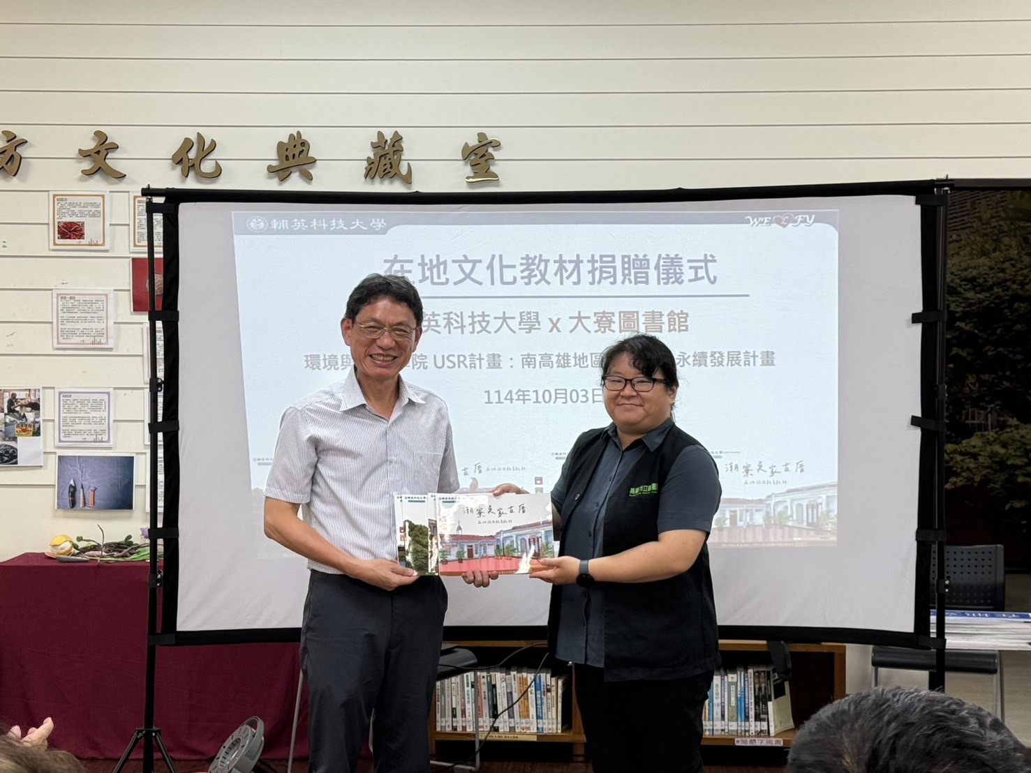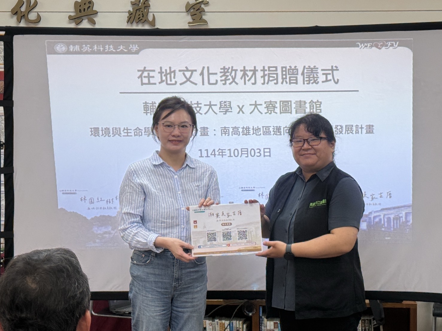 輔英科大環生學院(南高雄邁向環境永續發展計畫)三日上午也由林清和院長代表致贈高雄市立圖書館大寮分館數位影片、四本在地文化教材及一本歷屆環境教育競賽得獎書冊,由大寮分館何佳主任代表接受,世德工業陳怡樺經理、大寮區公所都派代表出席,多所國中小校長、社區協會文史專家都到場觀禮,世德工業長期支持本校在地教育推廣,積極參與社區連結與環境教育資源挹注,為本計畫的重要合作夥伴。